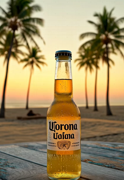 "Corona bottle (label visible, condensation dripping)",